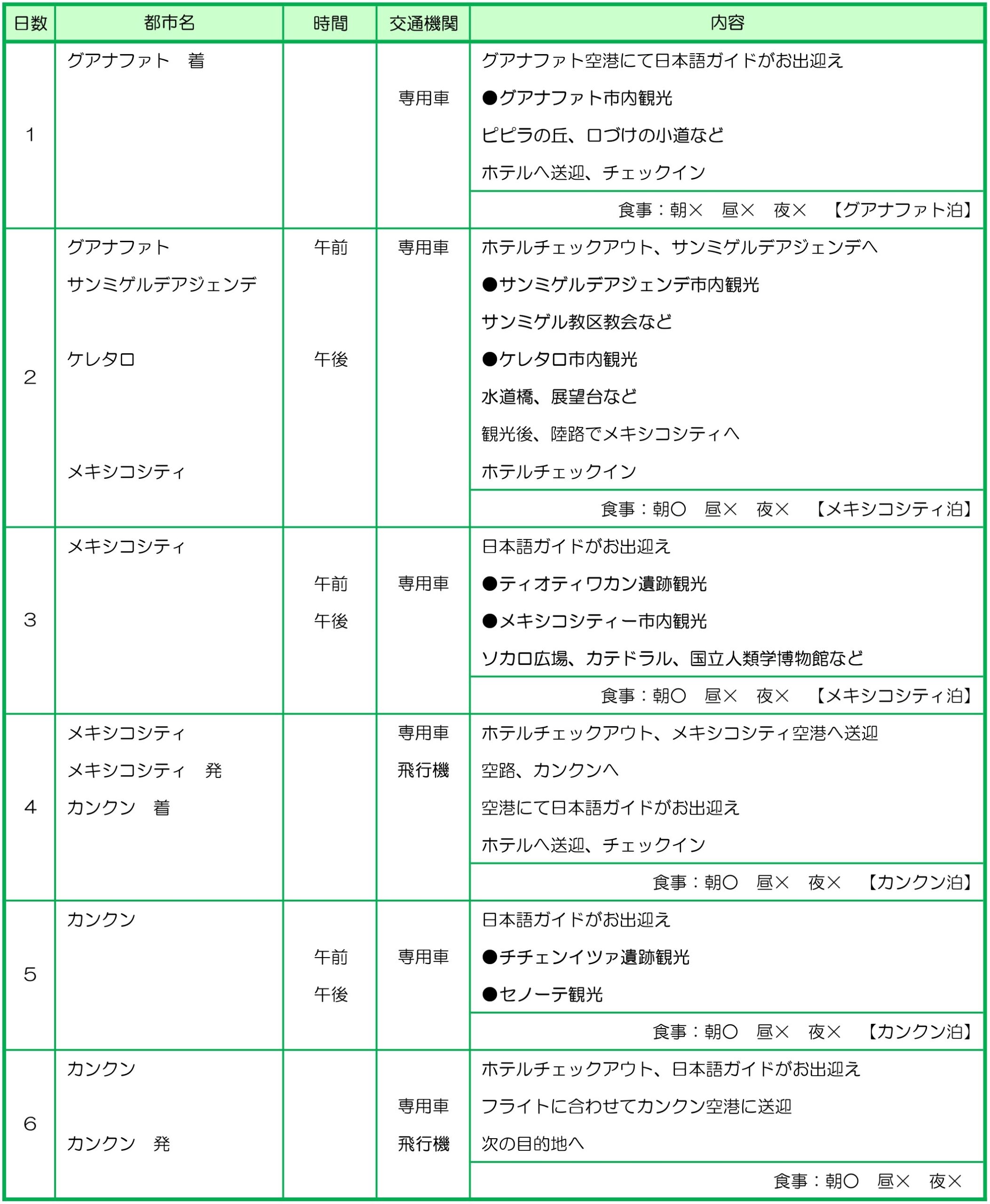 ①首都「メキシコシティ」のほか、カリブ海のリゾート「カンクン」、コロニアル都市「グアナファト」などメキシコの主要都市を周遊するコースです。